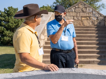 On a hot July morning in Kansas in 2022, nearly 80 men and women gathered under a blue- and white-striped tent to pray, reflect, and celebrate the work of World Missions at the former site of Bethel BIC. Large stone steps are all that remain of the church building, and a graveyard lies around it, quiet in the Kansas hills. International flags representing the countries in which this team serves snapped in the wind, and a drone flew overhead to record the event.