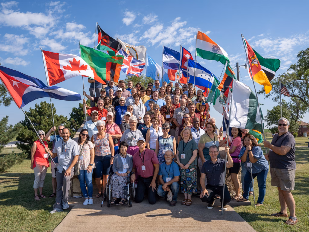 On a hot July morning in Kansas in 2022, nearly 80 men and women gathered under a blue- and white-striped tent to pray, reflect, and celebrate the work of World Missions at the former site of Bethel BIC. Large stone steps are all that remain of the church building, and a graveyard lies around it, quiet in the Kansas hills. International flags representing the countries in which this team serves snapped in the wind, and a drone flew overhead to record the event.